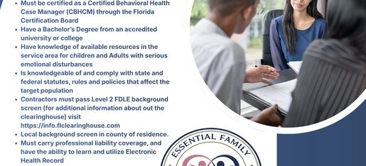 Essential Family & Community Services LLC has a team of experienced Florida Board Certified behavioral Health case managers and Supervisor.